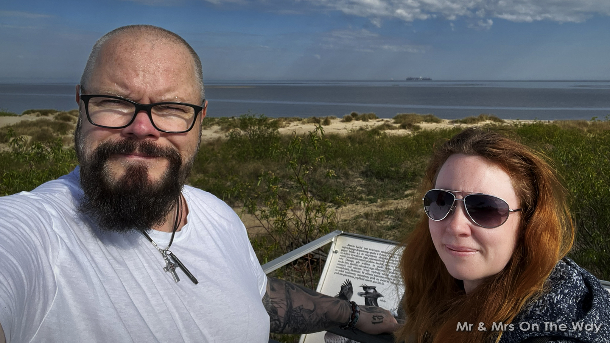 Docierając do ujścia Wisła, zatrzymaliśmy się przy niewielkim punkcie widokowym, gdzie umieszczono tablice przedstawiające gatunki ptaków występujących na tym obszarze. To doskonałe miejsce do obserwacji przyrody – zarówno tej skrzydlatej, jak i tej znacznie większej.