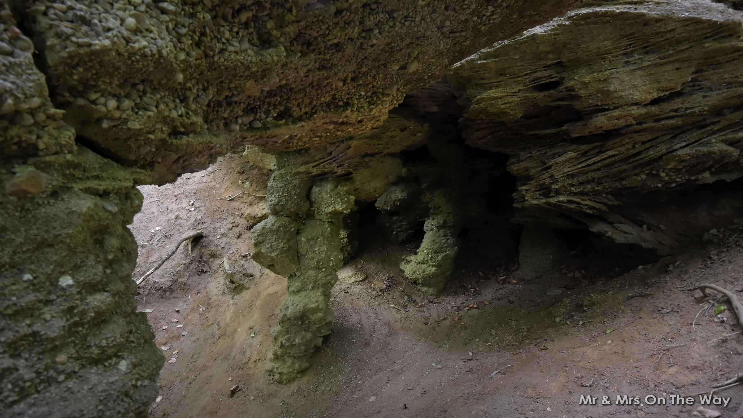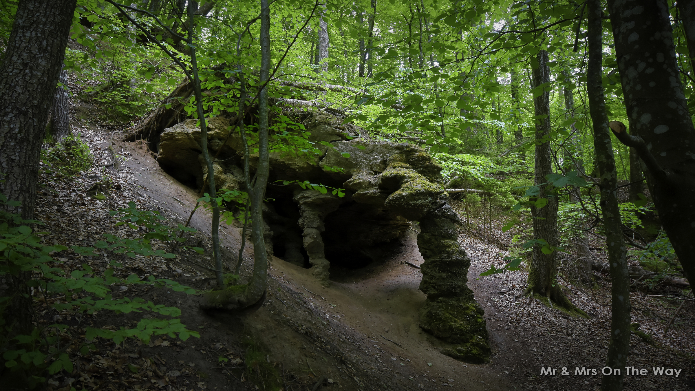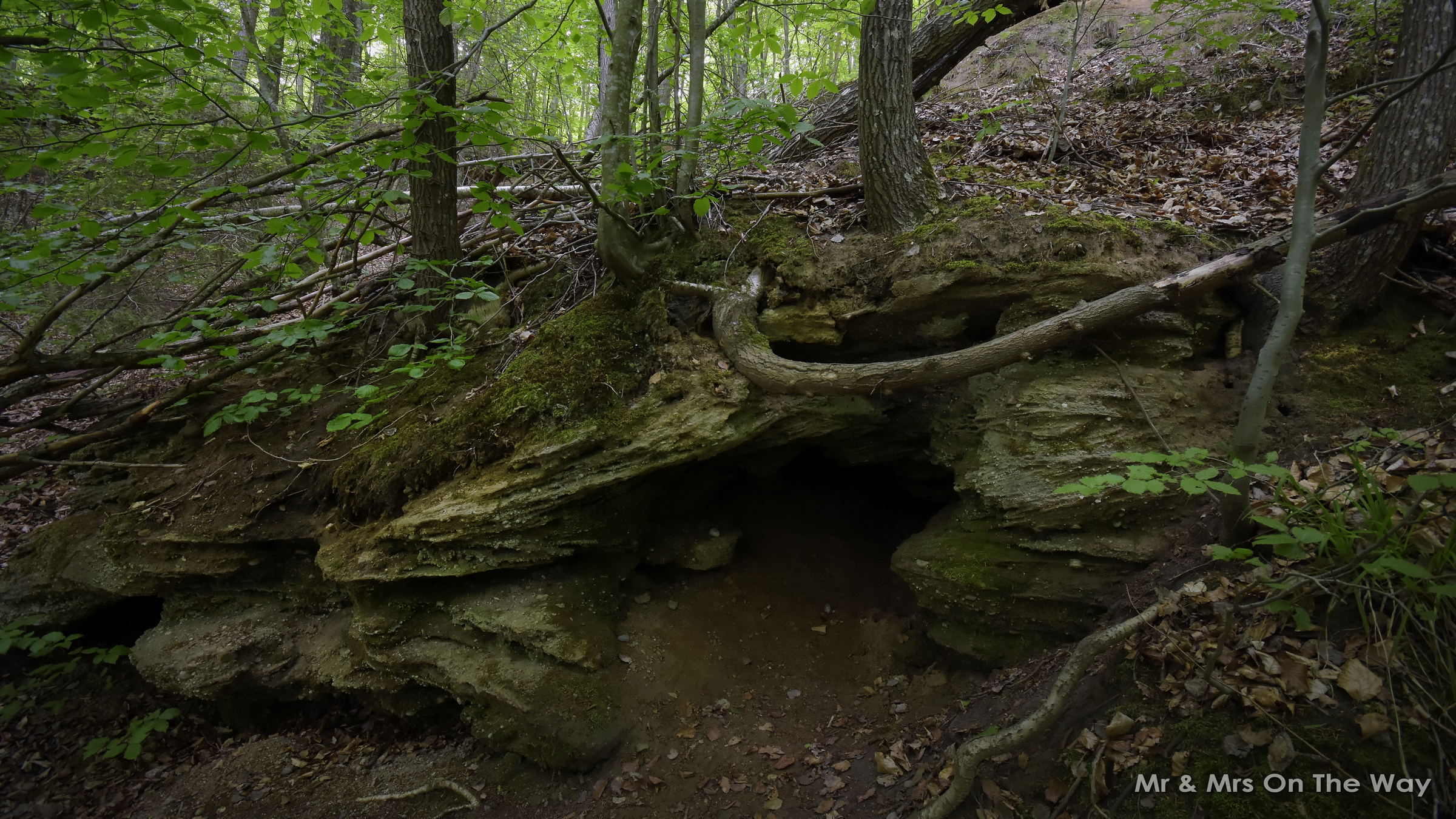 Przyznam, że nie spodziewałem się w tym regionie takich formacji. Groty mają naturalne pochodzenie – powstały w wyniku procesów erozyjnych i osuwiskowych w stromych zboczach porośniętych lasem. Nie są to rozległe jaskinie znane z południa Polski, lecz ich forma i surowy charakter zaskakują.